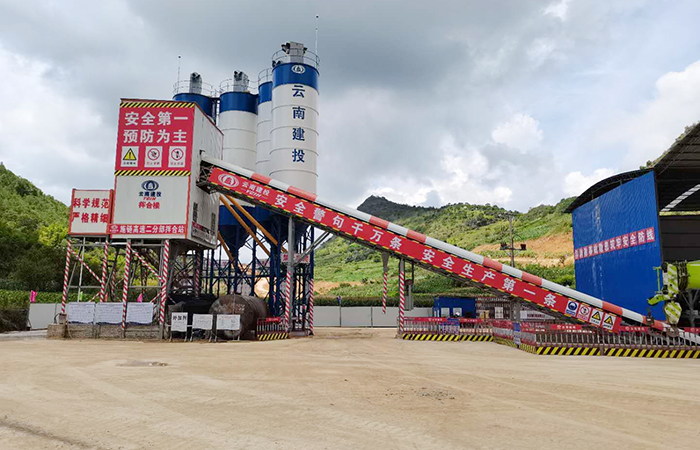 【拌合站概況】施鏈高速二分部自建拌合站選址于施甸縣萬興鄉(xiāng),拌合站具體位置為爛麥地右側(cè),K14+100左側(cè),占地面積9.93畝。考慮到復(fù)雜的周邊環(huán)境,拌合站在選址時依據(jù)了運輸距離較短、征地及復(fù)墾量少,以及場地周圍無塌方、滑坡、落石、泥石流、洪澇等地質(zhì)災(zāi)害的原則,最終建設(shè)地距主線近,交通便利,便于原材料進場及場內(nèi)生產(chǎn)的混凝土運至施工現(xiàn)場,拌合站管理便利。拌合站設(shè)有砂、石堆料儲料倉,共設(shè)5個料倉(石料倉3個、機制砂1個、河沙1個),總體尺寸為78.6m×16m。