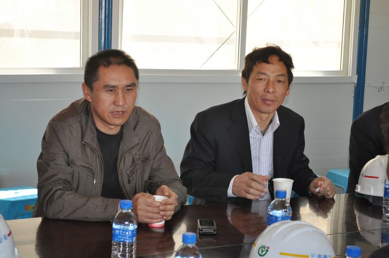 圖為開工當天公司總經(jīng)理魏華(左)為項目部作指示、提要求